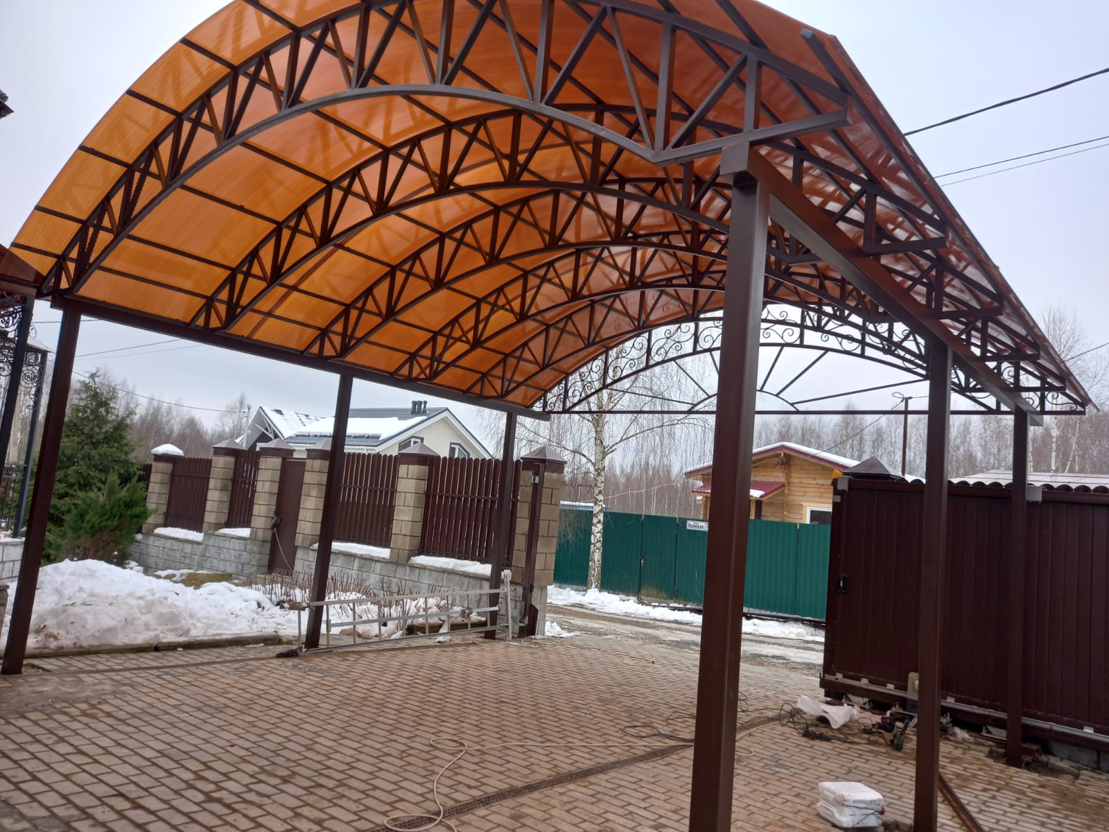 У нас можно приобрести, заказать или спроектировать навесы в виде дома небольшого размера, арки или иной, более сложной, интересной и оригинальной формы. Использование кованых элементов, изготовленных нашими профессиональными и опытными мастерами, сделают любую конструкцию не только удобным и полезным строением для загородной жизни, а и красивой деталью ландшафтного интерьера.